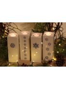 4 gyertyatartóból álló szett, a karácsonyt váró adventi vasárnapok gyertya gyújtásához. A nagyobb gyertyatartó méretei: magassága: 18,5 cm; oldalai: 6,5 cm. Kézzel készített tárgyak, kézzel festett mintával, természetes anyagokat felhasználva.